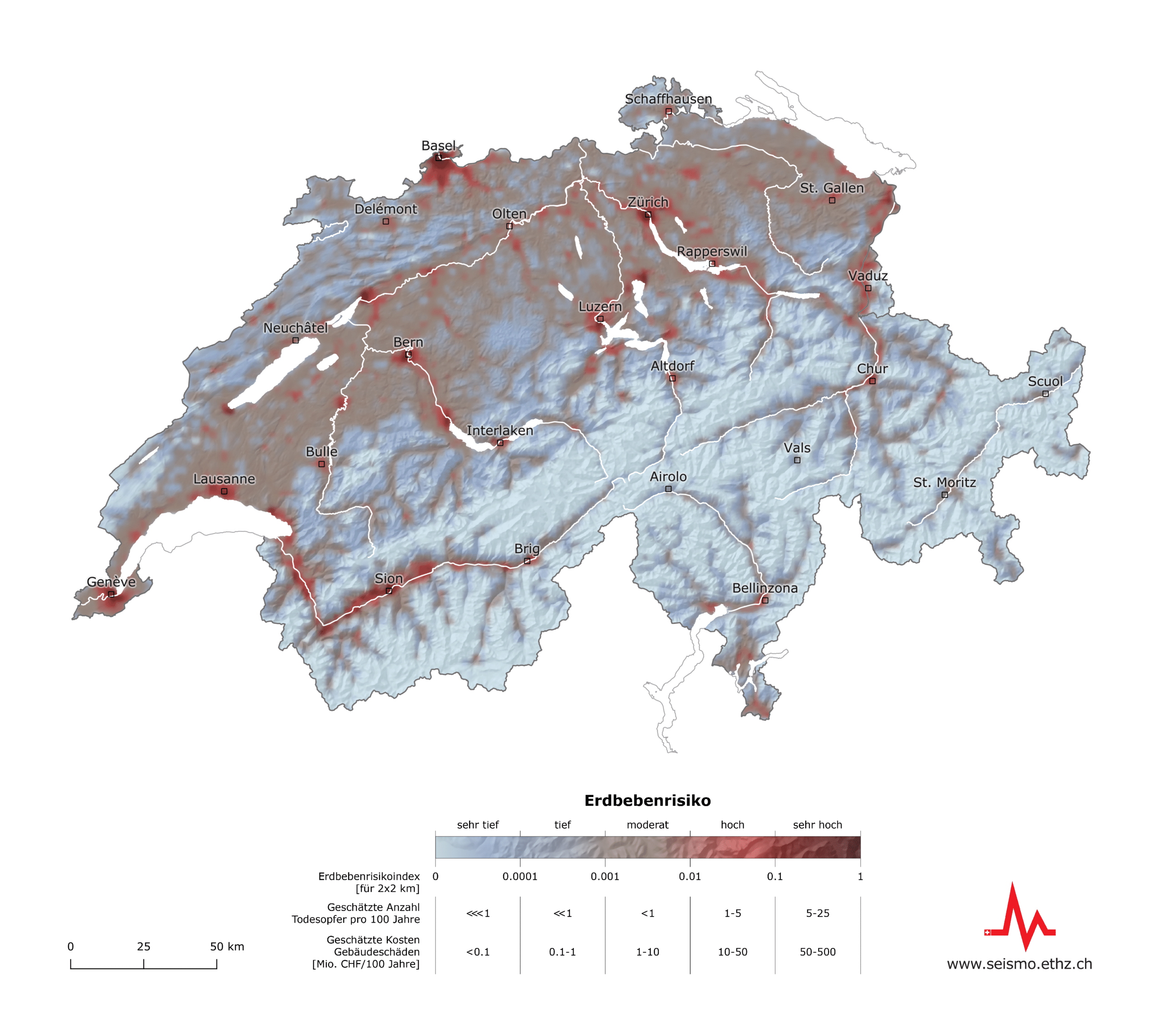 Das grösste Erdbebenrisiko besteht in der Stadt Basel, gefolgt von Genf, Zürich, Luzern und Bern. Wegen ihrer Grösse befinden sich in allen fünf Städten zahlreiche Personen und Werte, die bei einem Erdbeben betroffen wären. Das Risikomodell ermöglicht erstmals eine fundierte Schätzung der zu erwartenden Schäden. Dazu werden Werte basierend auf detaillierten Informationen zur Erdbebengefährdung, zum Einfluss des lokalen Untergrunds, zur Verletzbarkeit von Gebäude sowie zu den betroffenen Personen kombiniert.